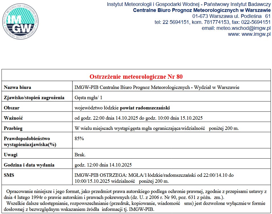 OSTRZEŻENIE METEOROLOGICZNE NR 80