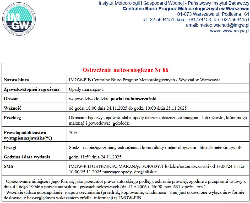 OSTRZEŻENIE METEOROLOGICZNE NR 86