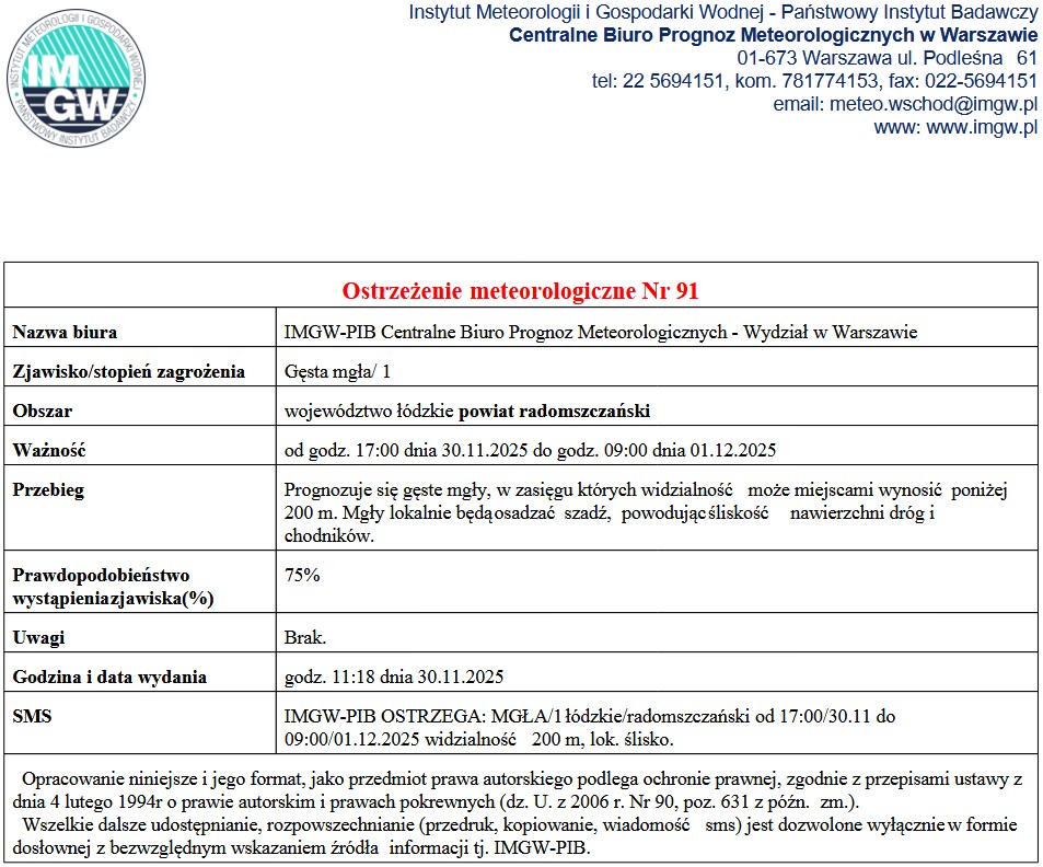 OSTRZEŻENIE METEOROLOGICZNE NR 91