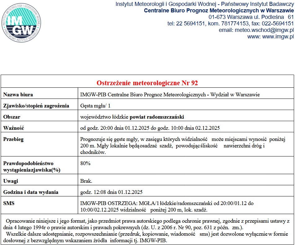 OSTRZEŻENIE METEOROLOGICZNE NR 92