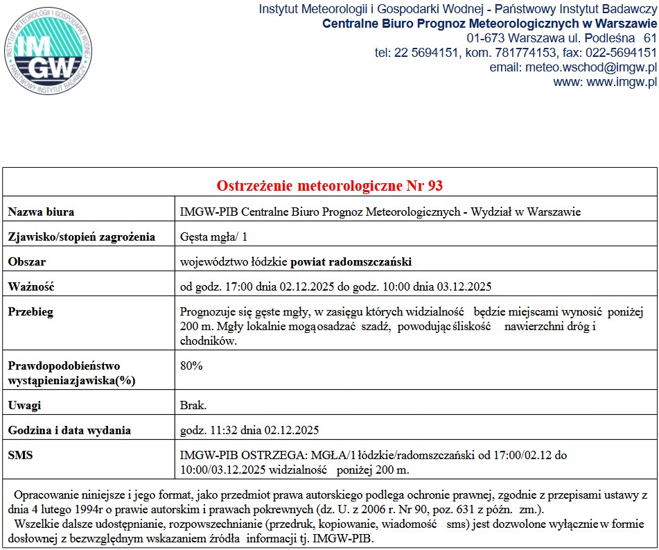 OSTRZEŻENIE METEOROLOGICZNE NR 93