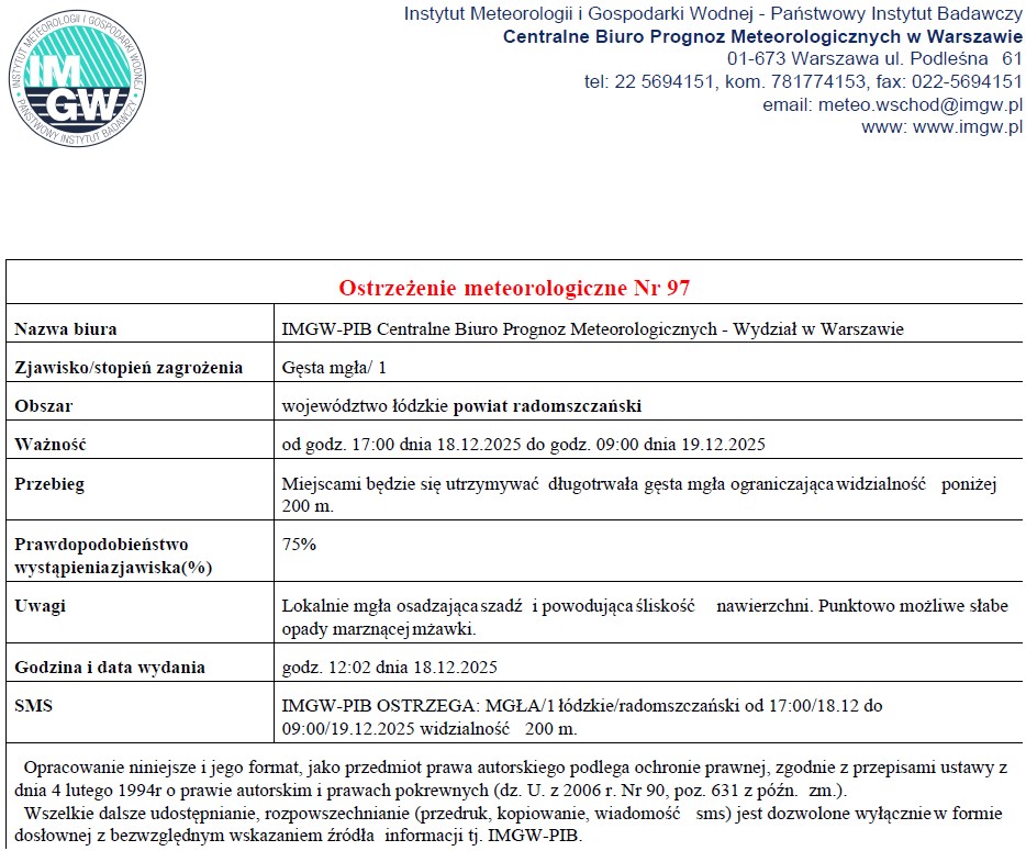 OSTRZEŻENIE METEOROLOGICZNE NR 97