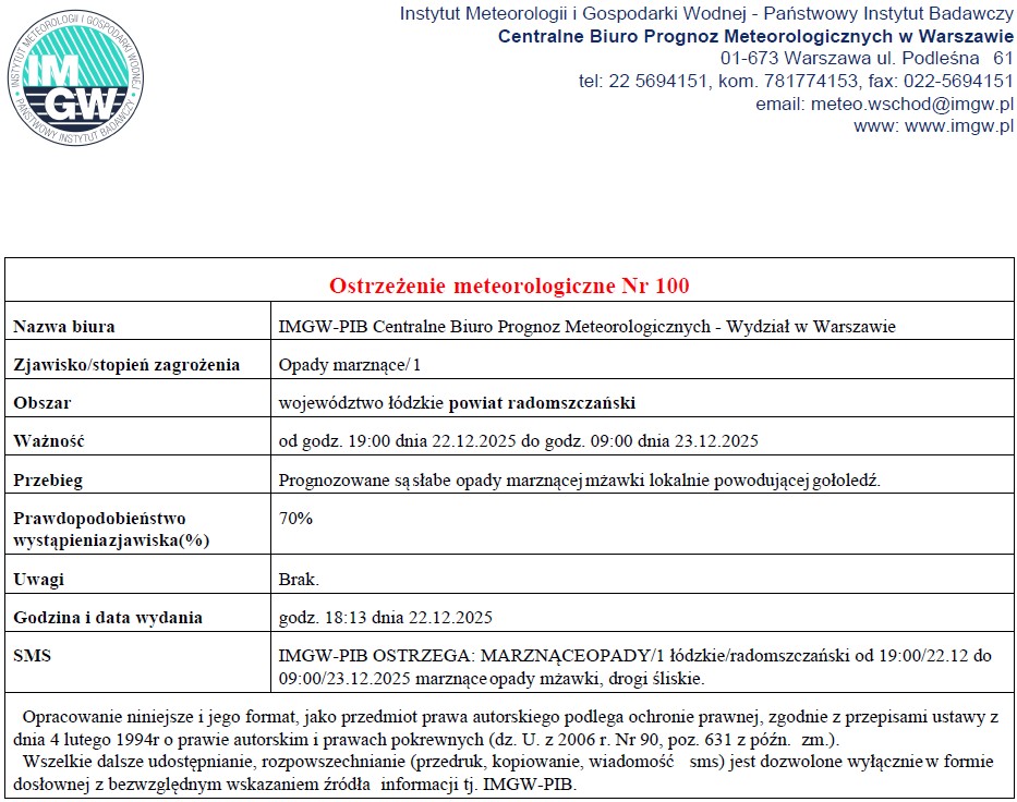 OSTRZEŻENIE METEOROLOGICZNE NR 100