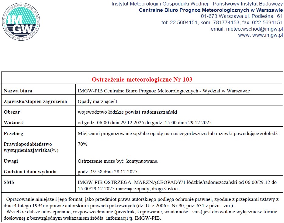 OSTRZEŻENIE METEOROLOGICZNE NR 104
