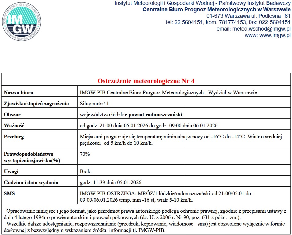 OSTRZEŻENIE METEOROLOGICZNE NR 4