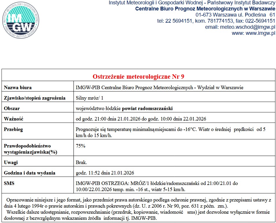 OSTRZEŻENIE METEOROLOGICZNE NR 9