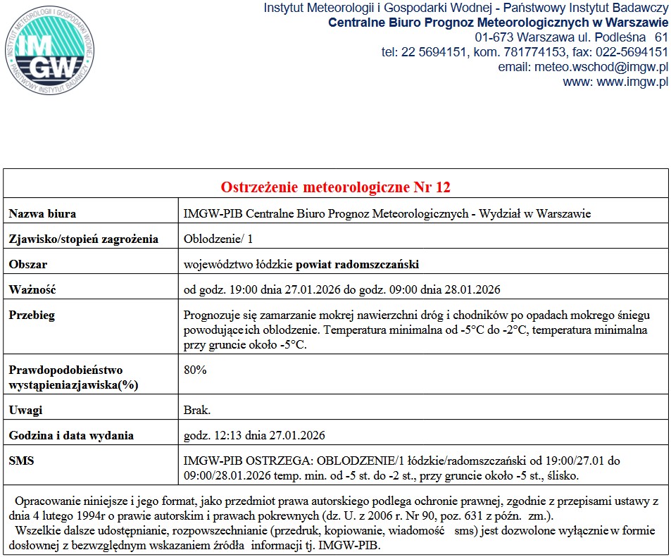OSTRZEŻENIE METEOROLOGICZNE NR 12
