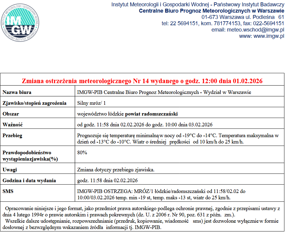 Zmiana ostrzeżenia meteorologicznego Nr 14
