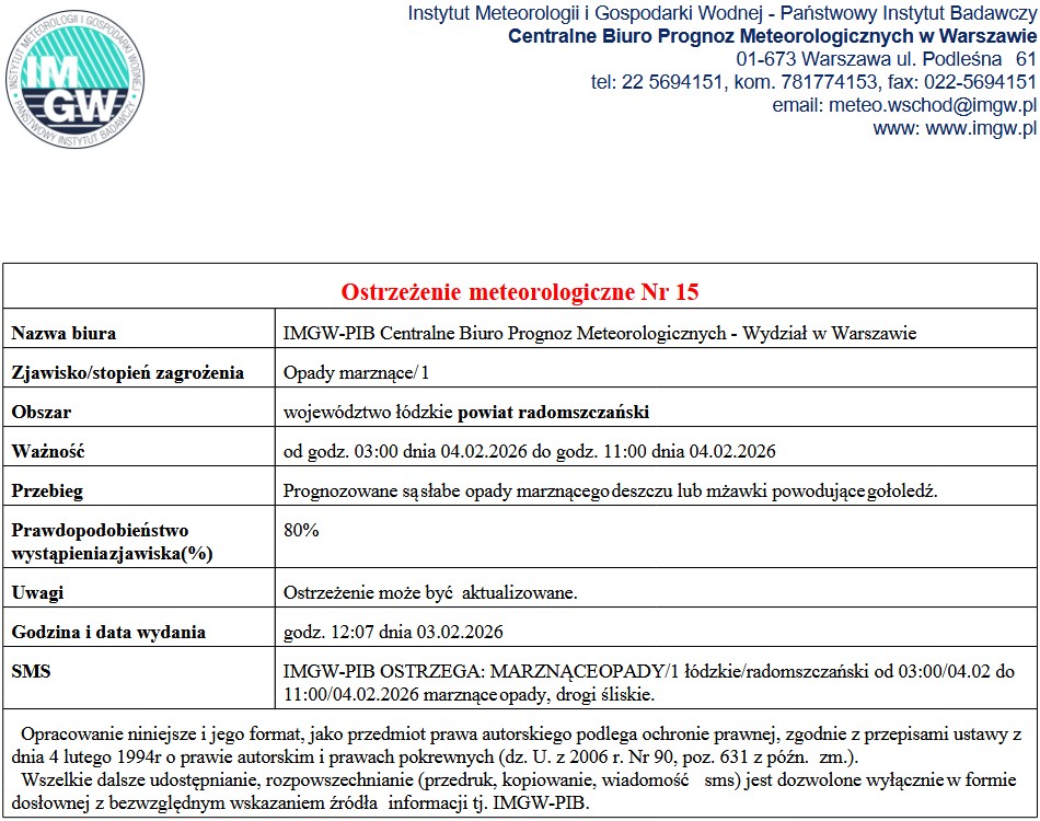 OSTRZEŻENIE METEOROLOGICZNE NR 15
