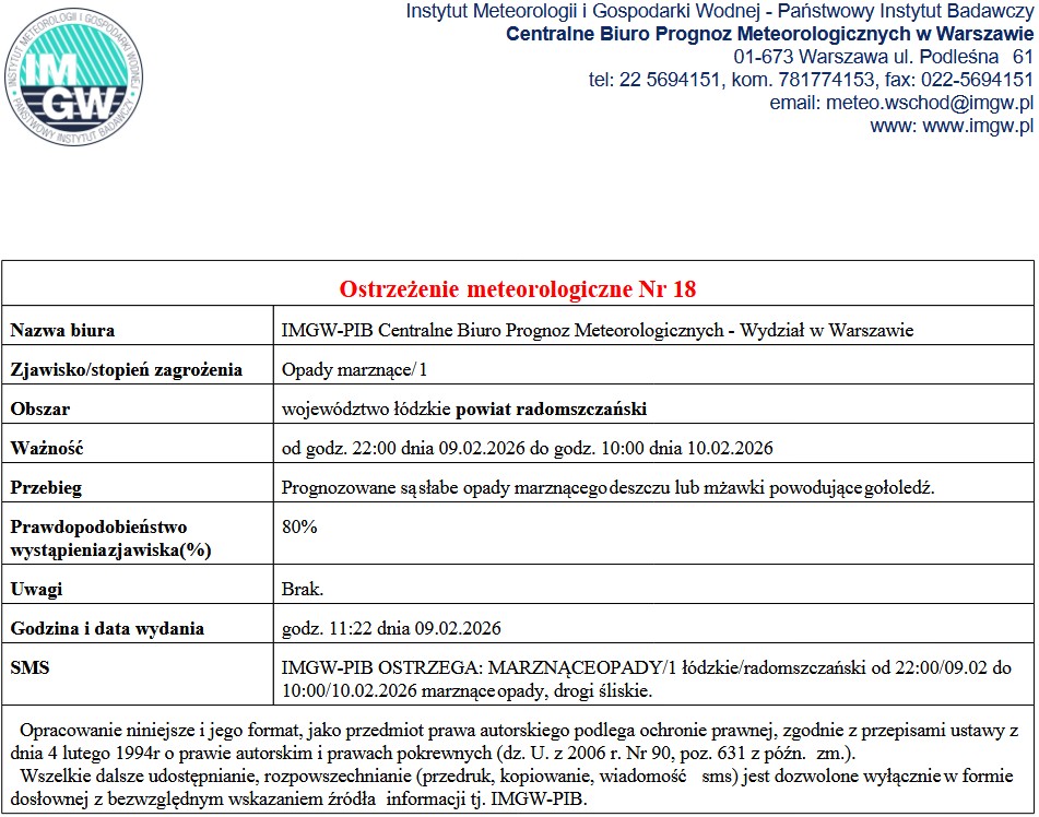 OSTRZEŻENIE METEOROLOGICZNE NR 18