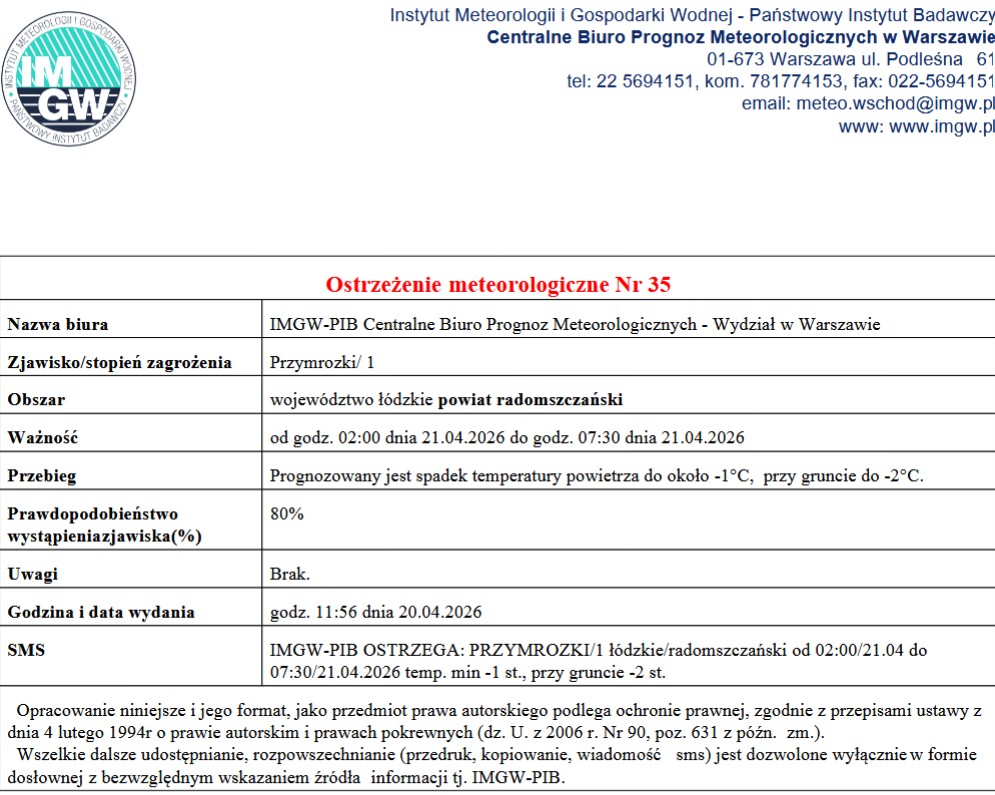 OSTRZEŻENIE METEOROLOGICZNE NR 35
